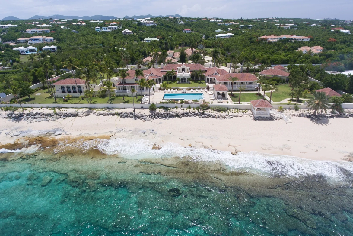 Le Château des Palmiers is a world-class beachfront estate that includes a 5-bedroom ocean side villa and a 4-bedroom garden side villa. Situated on the white sand beach at Plum Bay, this fabulous property provides an intimate, relaxed and attentive environment within the walls of a gated enclave. The many amenities include a huge heated pool, an open air and air conditioned fitness center, a tennis court, and covered outdoor bar, billiards and dining areas. The ocean side villa features 5 King Size bedrooms with full private baths including a two-storey master suite with a master bath with Jacuzzi tub and two private balconies facing the pool and the ocean. The remaining interior spaces include a fully equipped kitchen, a formal living room, a formal dining room seating 10 and a casual outside dining area and a media room.